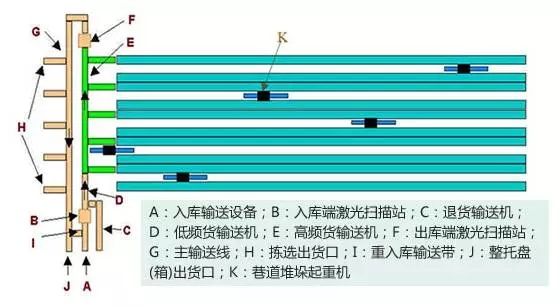 巷道式堆垛機只能在巷道內進行作業,而貨物存儲單元在巷道外的出入庫需要通過出入庫輸送系統完成。常見的輸送系統有傳輸帶、穿梭車(RGV)、自動導引車(AGV)、叉車、拆碼垛機器人等,輸送系統與巷道式堆垛機對接,配合堆垛機完成貨物的搬運、運輸等作業。